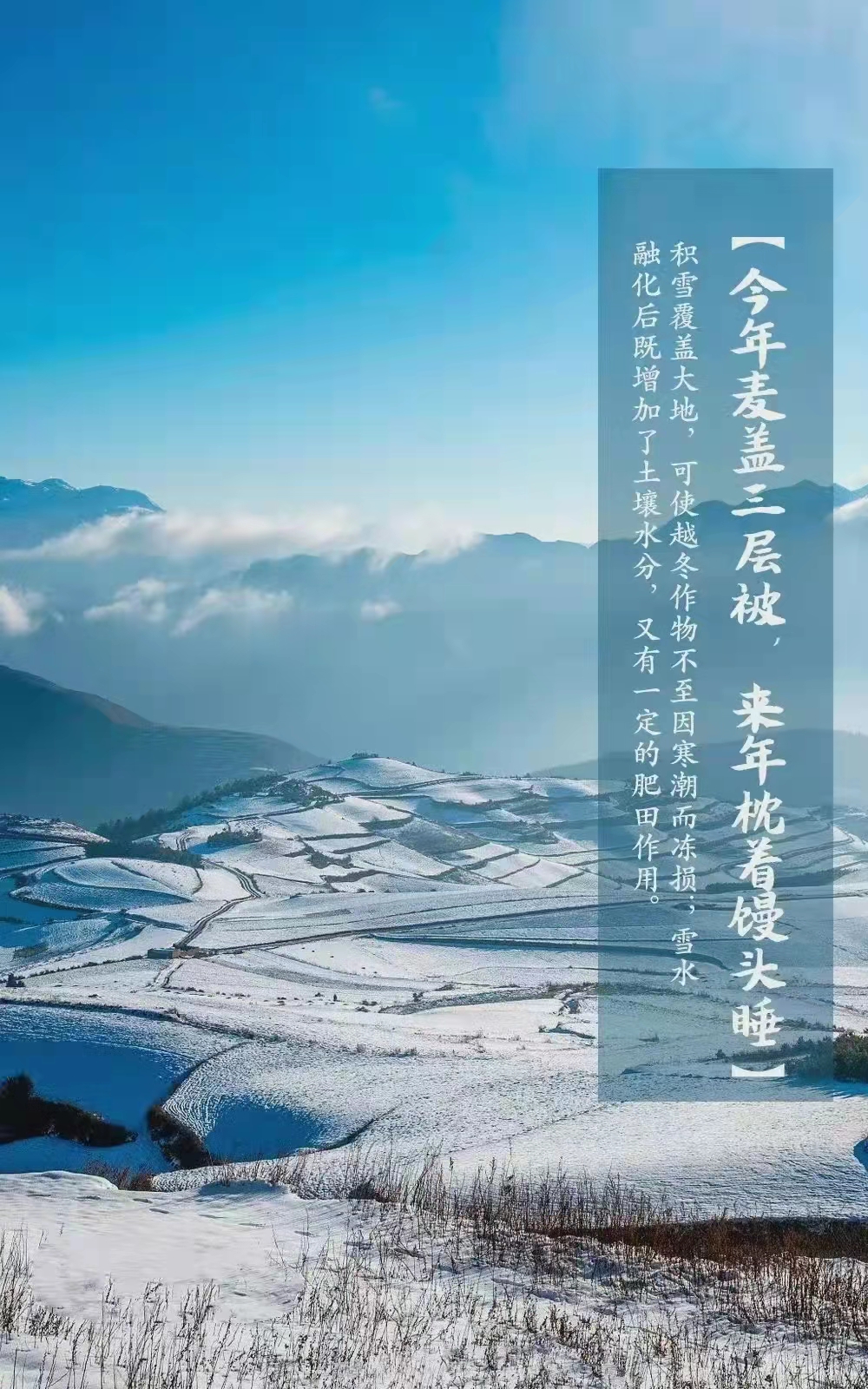 民间常说“瑞雪兆丰年”。严冬积雪覆盖大地,保持地面及作物周围的温度不会因寒流侵袭而降得很低,为冬作物创造良好的越冬环境。积雪融化时又增加了土壤水分含量,供作物春季生长的需要。
