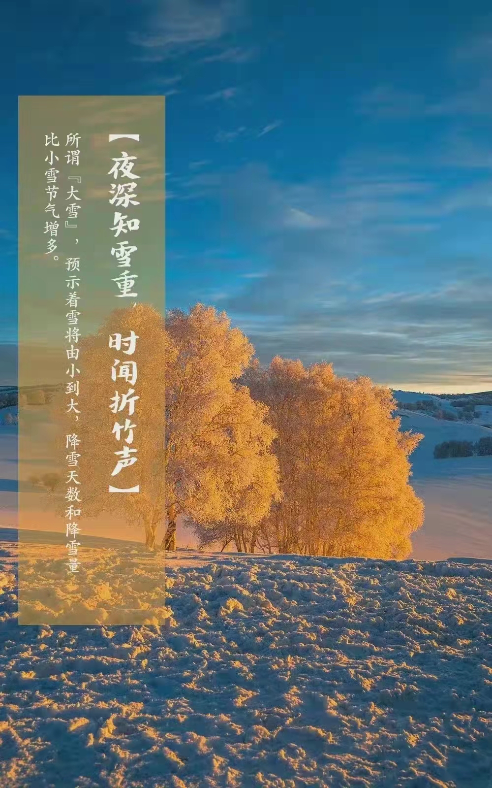 大雪,是二十四节气中的第21个节气,冬季的第三个节气。斗指癸,太阳到达黄经255度,交节时间为每年公历12月6-8日。大雪节气是干支历子月的起始,标志着仲冬时节正式开始。大雪节气与小雪节气一样,是反映气温与降水变化趋势的节气,它是古代农耕文化对于节令的反映。大雪是反映气候特征的一个节气,大雪节气的特点是气温显著下降、降水量增多。