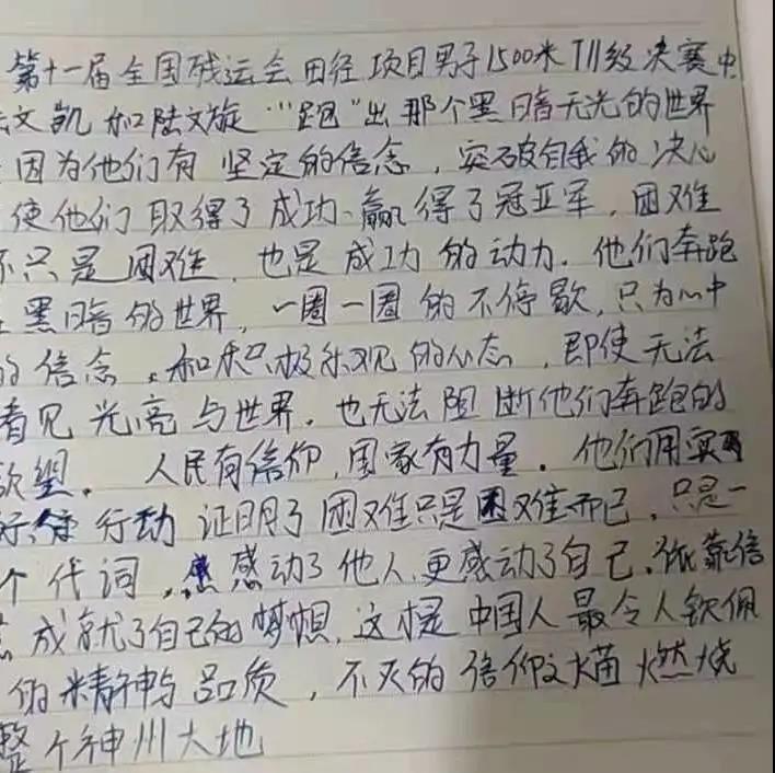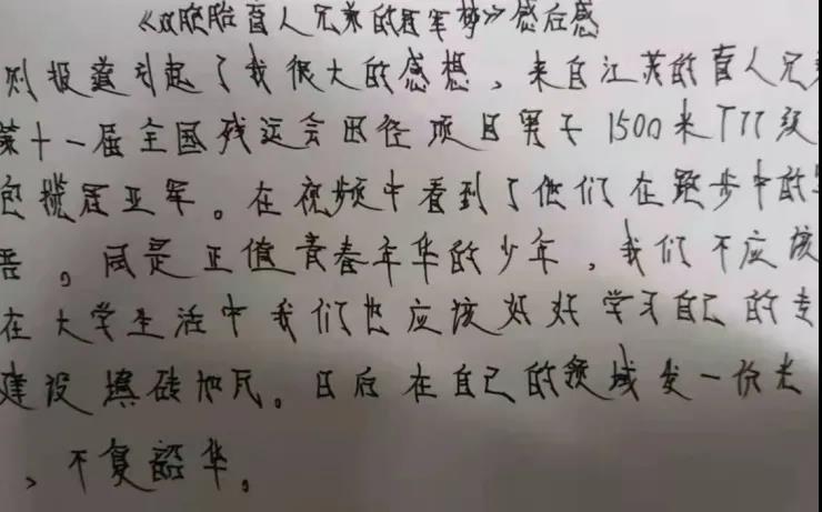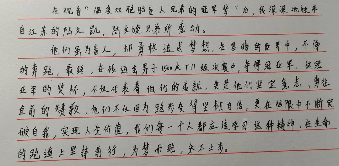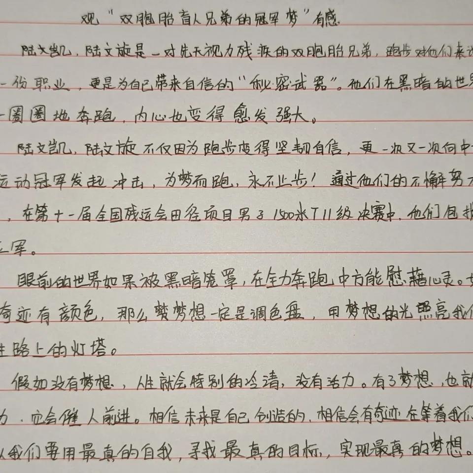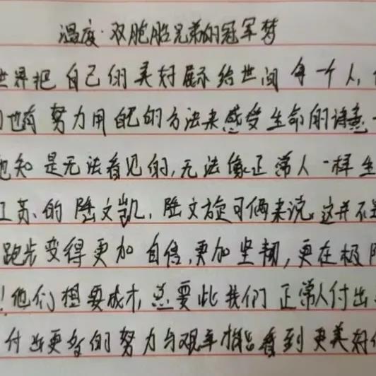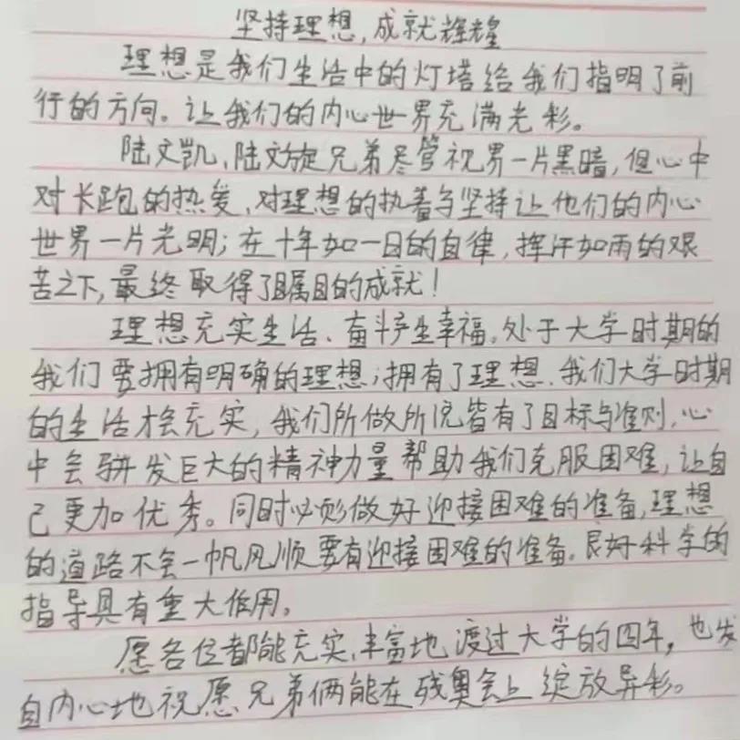 在第十一届全国残运会田径项目男子1500米T11决赛中,来自江苏的陆文凯、陆文旋双胞胎兄弟包揽了冠亚军。其实,他们的故事并不平凡,每个人的成功都是来之不易的。陆文旋说,“每天5点起床晨练,早训就要跑24圈左右,跑完以后不仅衣服都可以拧出水,感觉每个毛孔都在流汗,鞋子也会被汗水浸湿,这时光脚走在地上是可以留下脚印的”。“跑步再苦也是乐,通过跑步我们取得了荣誉,找到了自信和未来要努力的方向,现在唯有更加努力才行。”双胞胎兄弟说。“他俩的梦想就是要代表中国队站在奥运赛场上,这就是他们的动力,也是他们兄弟俩一辈子的梦想。” 陆文凯说。