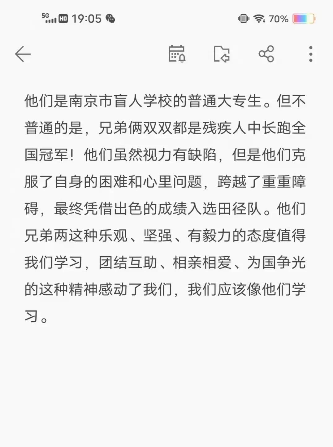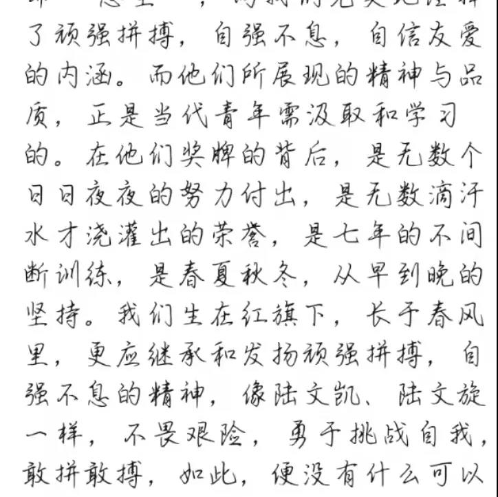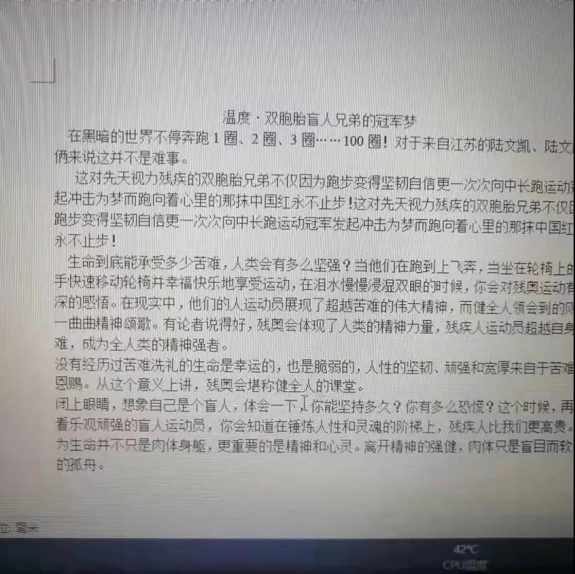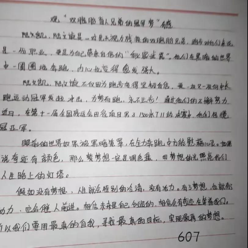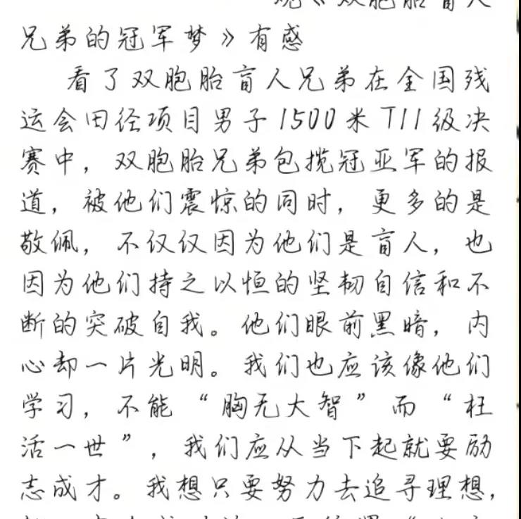 在第十一届全国残运会田径项目男子1500米T11决赛中,来自江苏的陆文凯、陆文旋双胞胎兄弟包揽了冠亚军。其实,他们的故事并不平凡,每个人的成功都是来之不易的。陆文旋说,“每天5点起床晨练,早训就要跑24圈左右,跑完以后不仅衣服都可以拧出水,感觉每个毛孔都在流汗,鞋子也会被汗水浸湿,这时光脚走在地上是可以留下脚印的”。“跑步再苦也是乐,通过跑步我们取得了荣誉,找到了自信和未来要努力的方向,现在唯有更加努力才行。”双胞胎兄弟说。“他俩的梦想就是要代表中国队站在奥运赛场上,这就是他们的动力,也是他们兄弟俩一辈子的梦想。” 陆文凯说。