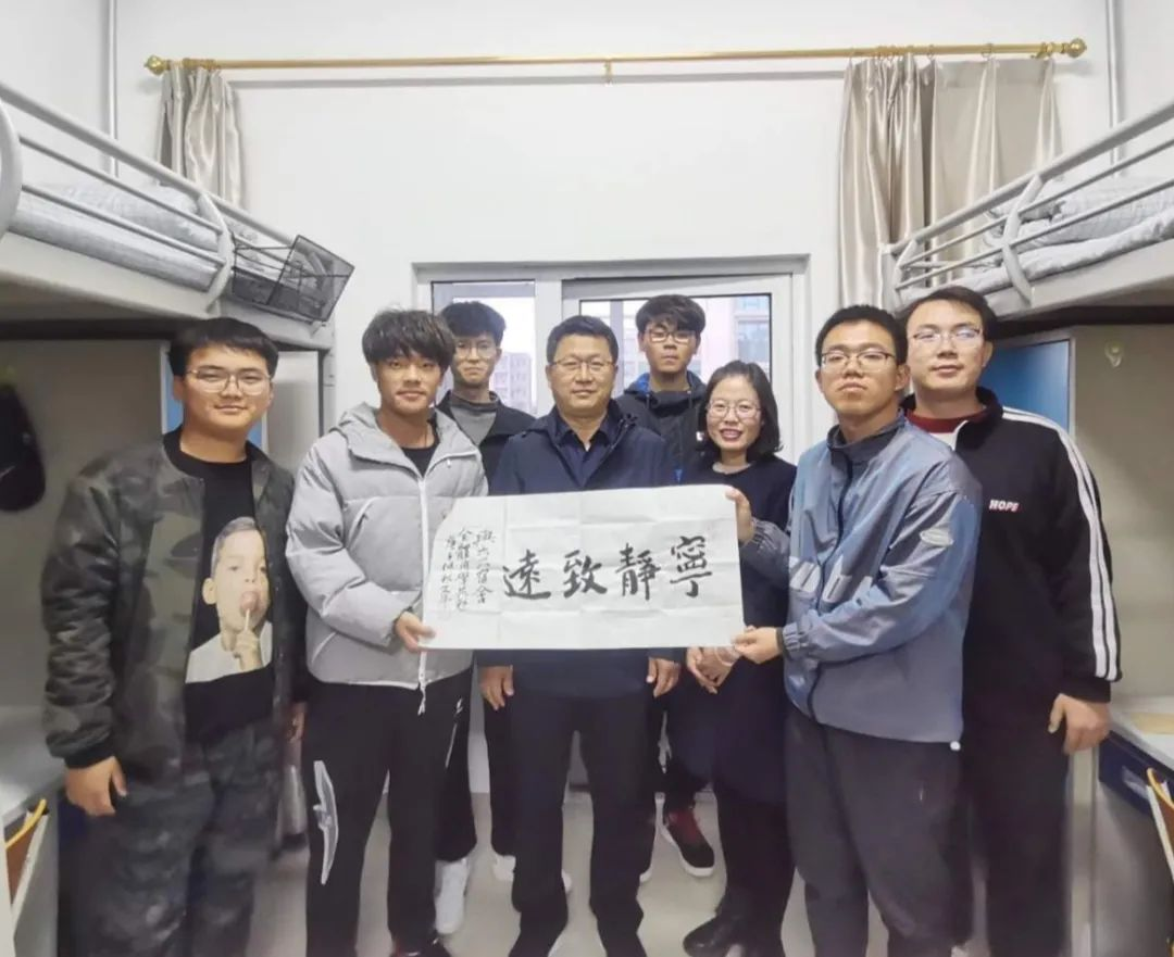 活动后,秦书记来到7号员工公寓,深入2020级材料化学班宿舍进行走访,仔细查看了宿舍安全卫生情况,详细询问了员工入学后的生活情况和遇到的困难。他还向同学们赠送了亲笔书写的书法作品,叮嘱同学们一定要营造良好的宿舍文化氛围,珍惜宿舍同学之间的友谊,系好人生的第一粒扣子。