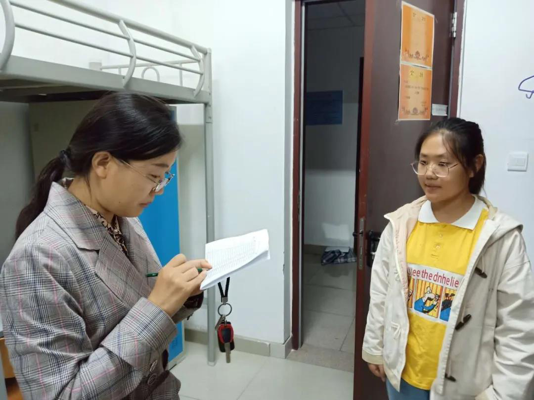 晚上,迎新工作人员深入宿舍了解新生入住情况。老师们逐一查看每个新生宿舍,耐心的询问新生适应情况、存在的问题等,新生们热情的与老师们交流他们的所感、所悟,憧憬着老员工活的全面开启。