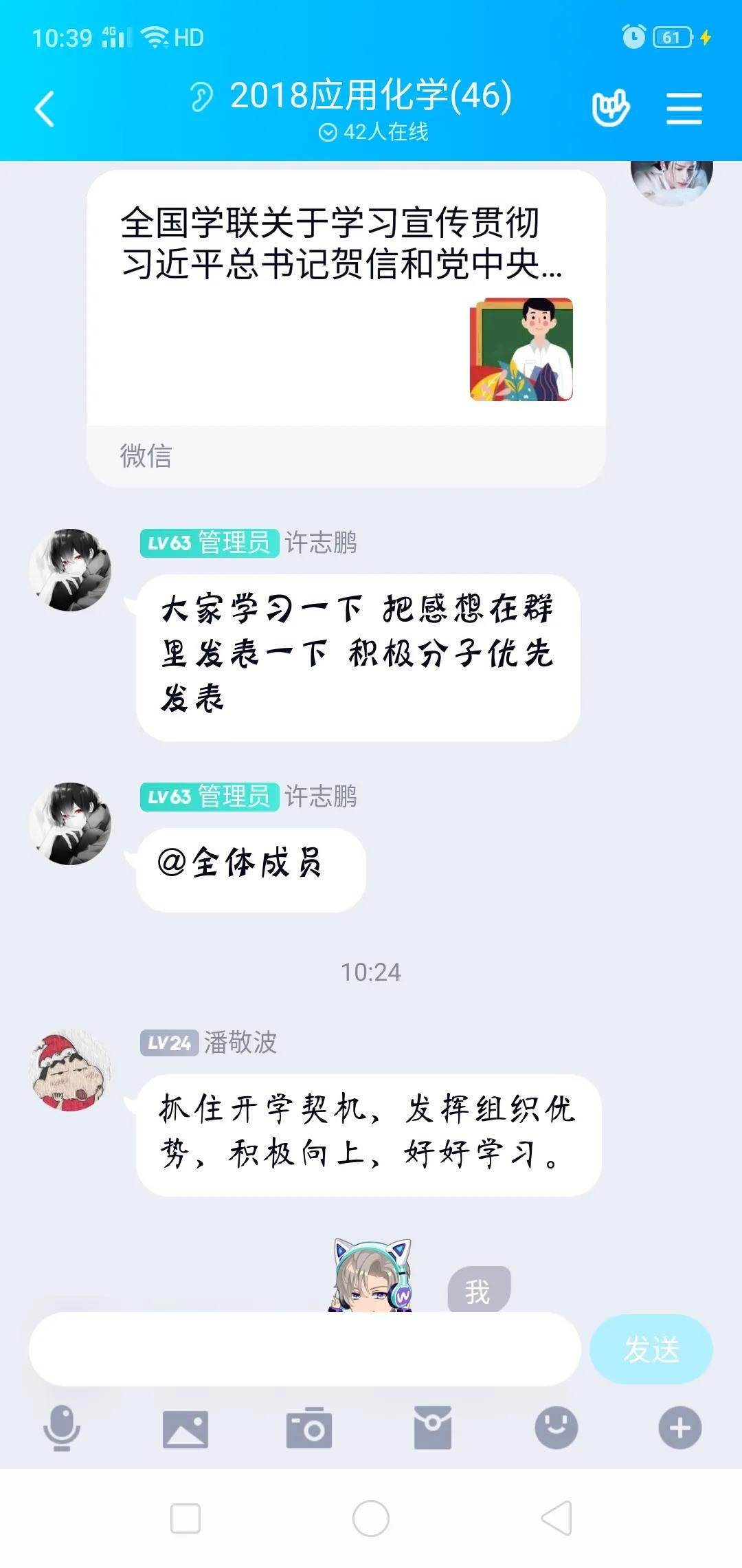 2020年9月4日,为响应全国学联关于学习宣传贯彻习近平总书记贺信和党中央致辞精神的工作安排,化学工程系各班通过线上班会,认真学习了关于学习宣传贯彻习近平总书记贺信和党中央致辞精神的工作安排。