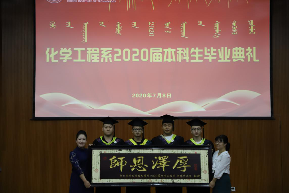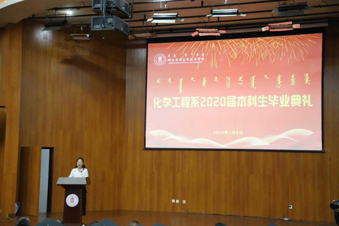 在庄严的国歌声中,毕业典礼拉开了序幕。之后,学工处负责人岳晓燕老师宣读了《化学工程系2020届毕业生先进个人表彰名单》。党总支书记梁建华老师和系主任吴珍老师为获奖同学颁奖。