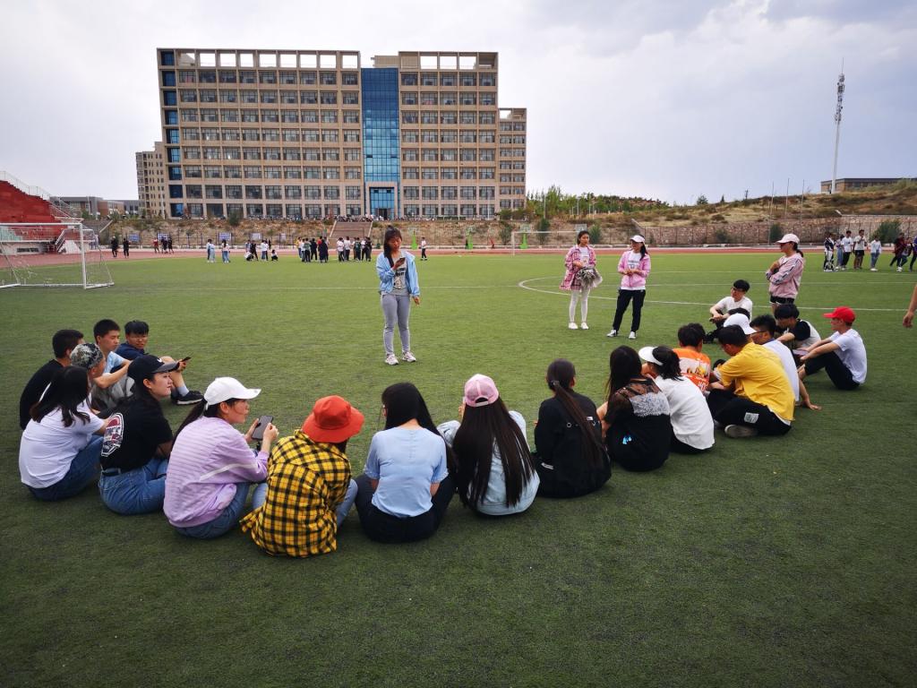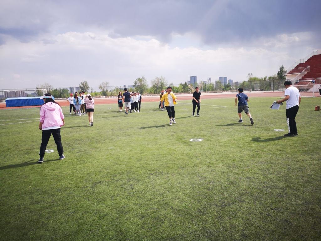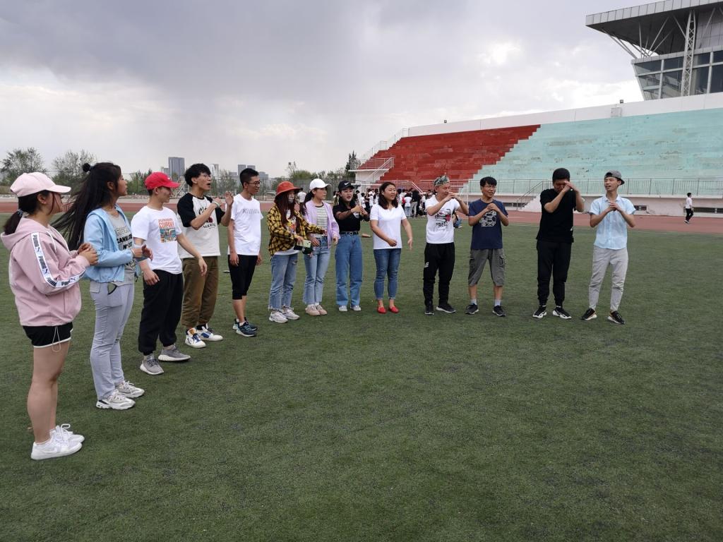 活动由团总支书记岳晓燕老师和辅导员李斌老师带领同学在田径场做了一些趣味运动。首先将同学们分成三个小组,由小组组长带领队员展示自己的队名、队歌、队形,由两位老师进行评比打分。随后每个小组合作进行了拓展训练项目(超音速)。活动结束后,岳晓燕老师作了总结讲话,她鼓励同学们要积极参加户外活动,不断丰富校园文化生活,正确认识自我、完善自我,努力提高心理素质,以更理性平和、积极阳光的心态来度过老员工活。