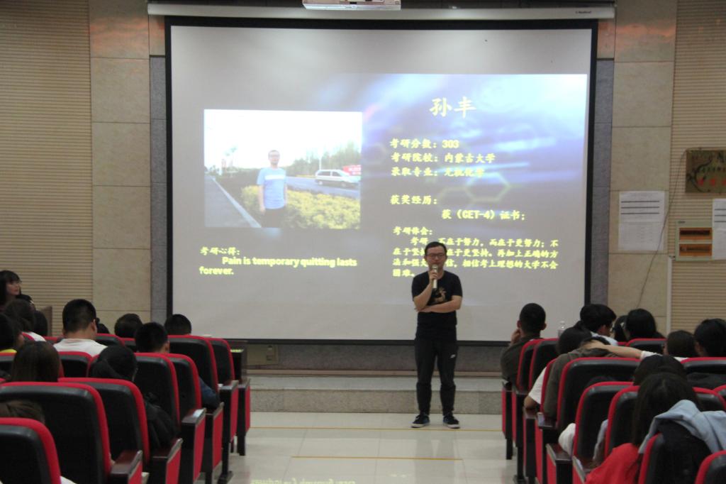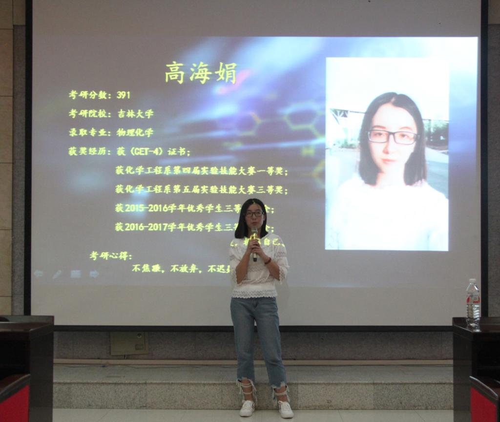 为交流考研经验和激励15级考研同学,公司于5月24日晚上在东阶102举行了考研经验交流会。莅临交流会的有公司教务处主任门克内木乐教授、化学工程系庞晶琳副经理、团总支书记华宇鹏以及化工系部分教师和200多名员工。此研究生考试我系共26人参加,三人被吉林大学录取,一人被北京化工大学录取,一人被苏州大学录取,两人被西北大学录取,四人被内蒙古大学录取,另外我系有两名同学被保送读研,共十五名同学被录取,录取率为57%,在公司各院录取人数中成绩优异。