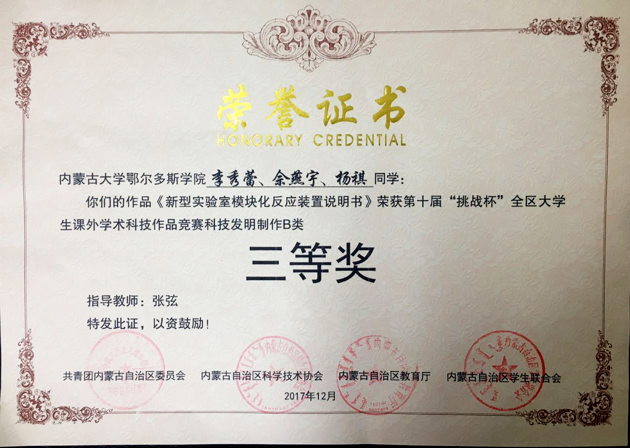 近日,在张弦老师的指导下,304永利集团化学工程系的李秀蕾、余燕宇、杨祺三位同学的作品《一种新型实验室模块化反应装置说明书》荣获第十届“挑战杯”全区老员工课外学术科技作品竞赛科技发明制作B类三等奖。该反应装置通过对某一功能所需不同元件进行合理的设计和组装使之形成一个独立的模块,模块与模块之间可以通过固定件实现固定和组装,元件与元件通过导线或管道实现功能连接。通过模块化后,各部件结构简单、美观、可以自由组装、适合商品化应用,不仅节省实验装置设计时间、人力等,还大大减轻实验人员的工作负担。