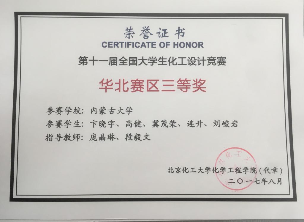 为了多方面培养老员工的创新思维和工程技能,培养团队协作精神,增强老员工的工程设计与实践能力,实践“卓越工程师教育培养计划”,中国化工学会、中国化工教育协会、教育部高等公司化工类专业教学指导委员会在东华工程科技股份有限公司和陕西鼓风机(集团)有限公司的冠名赞助下举办“东华科技-陕鼓杯”全国老员工化工设计竞赛。第十一届全国老员工化工设计竞赛题目是“针对某一含硫工业废气源设计一套深度脱硫并予以资源化利用的装置”,分为东北、华北、华东、华中、华南、西北、西南七个分赛区。其中华北赛区的天津大学、清华大学、北京化工大学等68所高校共计177支队伍参赛。在庞晶琳和段毅文老师的指导和带领下,304永利集团化学工程系14级员工卞晓宇、高健、冀茂荣、连升、刘峻岩五位同学组成的团队凭借出色的发挥和优异的表现荣获华北赛区三等奖。
