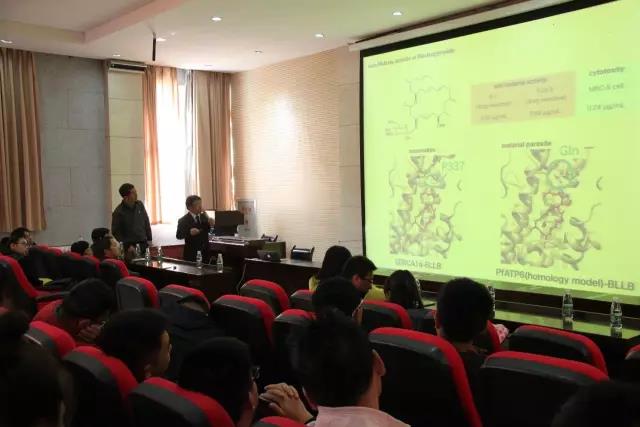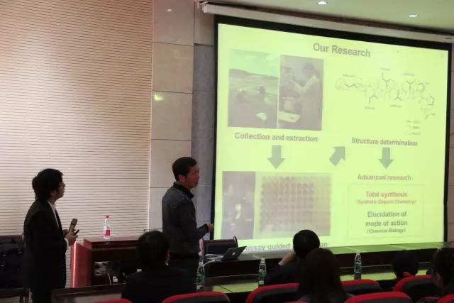 讲座中,岩﨑有紘研究助理对庆应义塾大学做了简介并以“Discovery, total synthesis andmode of action of kurahyne, a novel ER stress –inducer from a marinecyanobacterium ” 为主题做出讲述,对kurahyne这个从海洋蓝藻中分离的物质从它的活性、研究对癌细胞作用以及它的总合成三个方面的过程详细讲解通过大屏幕上详细的化学结构式和助理细心地讲解让同学们更加直观的解了这种新物质的总合成和作用方式,以及未来的使用方向;接下来末永聖武教授以“Structure, biological activities, and totalsynthesis ofbiselyngbyasides from marine cyanobacteria”为主题做出讲述,利用详细的化学结构式和合成步骤对biselyngbyasides的结构和合成进行讲解。通过教授耐心的讲解,配合着图片上简洁明了的合成步骤和结构式,让大家深刻了解了这种新型物质的作用。通过这节讲座让同学们受益匪浅,并认识到这种新型物质对癌症的强大的抵抗作用。