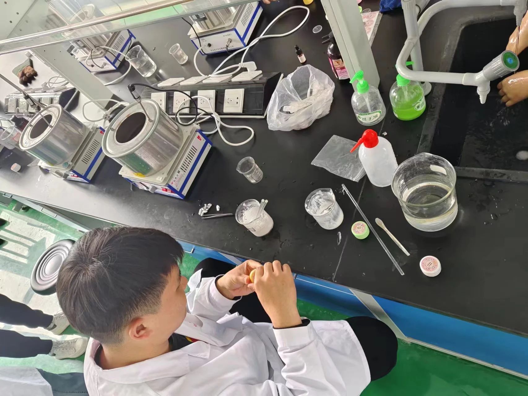 活动中,张名老师介绍了组织活动的目的和意义。祁宏蕾向大家讲解制作雪花膏的原理以及步骤,并强调了实验中注意的事项及安全问题。之后大家纷纷开始制作,按照配方称取药品,待融化后,将碱溶液高温消毒后慢慢加入融化好的油相中,发生皂化反应,等待二十分钟后,拿出放凉雪花膏便做成功了。大家在实验中尽情体验手工制作的喜悦。