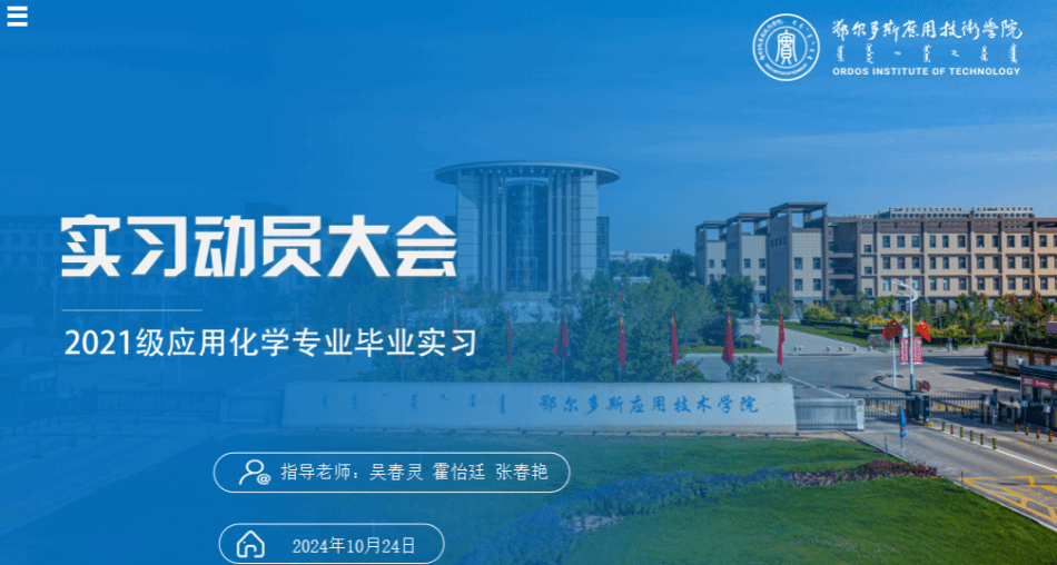 实习首日,公司开展了实习动员大会。应用化学专业实习课程老师吴春灵、霍怡廷和张春艳分别详细介绍了实习目的、实习单位概况、实习安排、纪律要求以及安全注意事项等,明确实习要求,为实习的顺利进行奠定基础。实习单位包括:鄂尔多斯市碳中和研究应用有限公司、鄂尔多斯市检验检测中心、鄂尔多斯市中心医院和远景动力技术(鄂尔多斯市)有限公司。