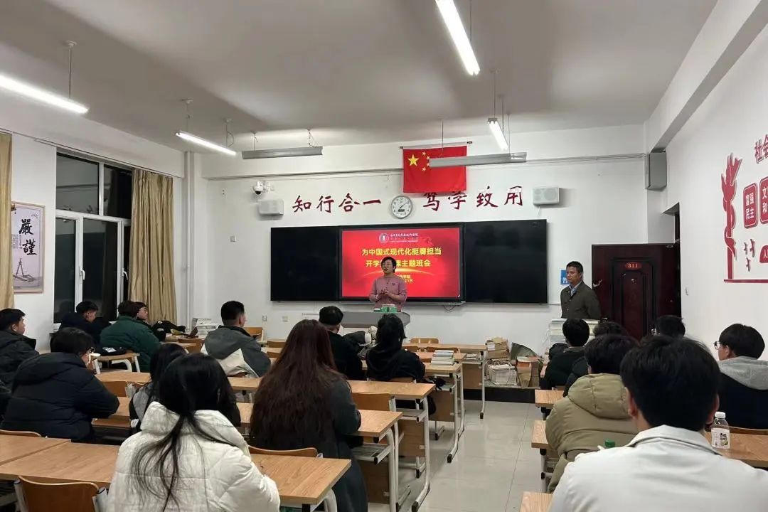 本次主题班会中,班主任老师围绕党的二十大、二十届二中、三中全会精神以及习近平总书记关于教育的重要讲话精神进行了阐述,之后就校园安全、心理健康、班风建设、学业规划、宿舍卫生等方面进行讲解和引导。党总支副书记于海合在班会上强调了新学期的学习目标和安全意识的重要性,勉励同学们在新学期中保持积极向上的精神风貌,努力提升自身综合素质。