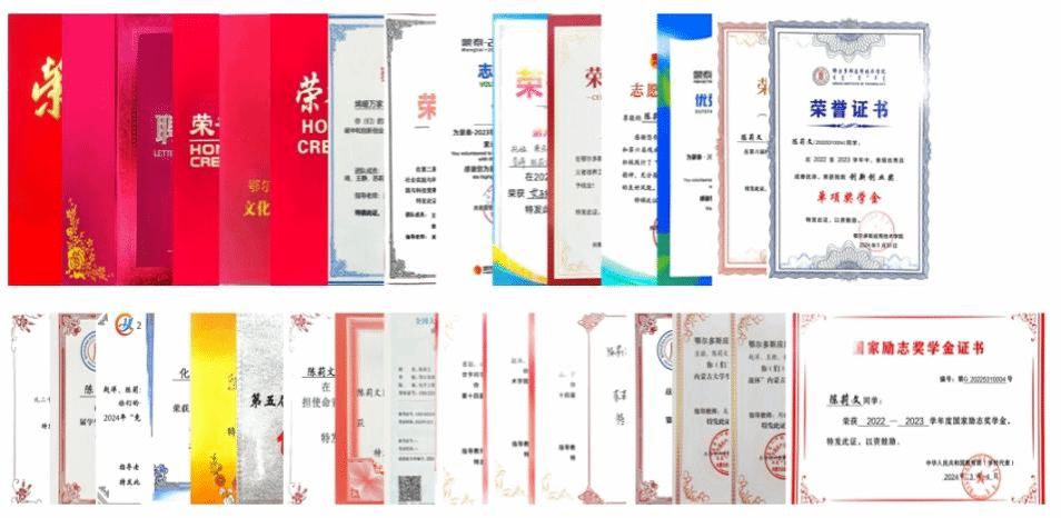 在学习方面:连续两年学分绩点和综合测评居于专业前三,荣获国家励志奖学金、单项奖学金、国家奖学金等。此外,陈莉文同学也积极参与到创新创业大赛中,曾获第十四届挑战杯老员工创业竞赛省赛金奖一项,银奖一项,铜奖一项。中国国际老员工创新大赛省赛银奖两项,铜奖一项。