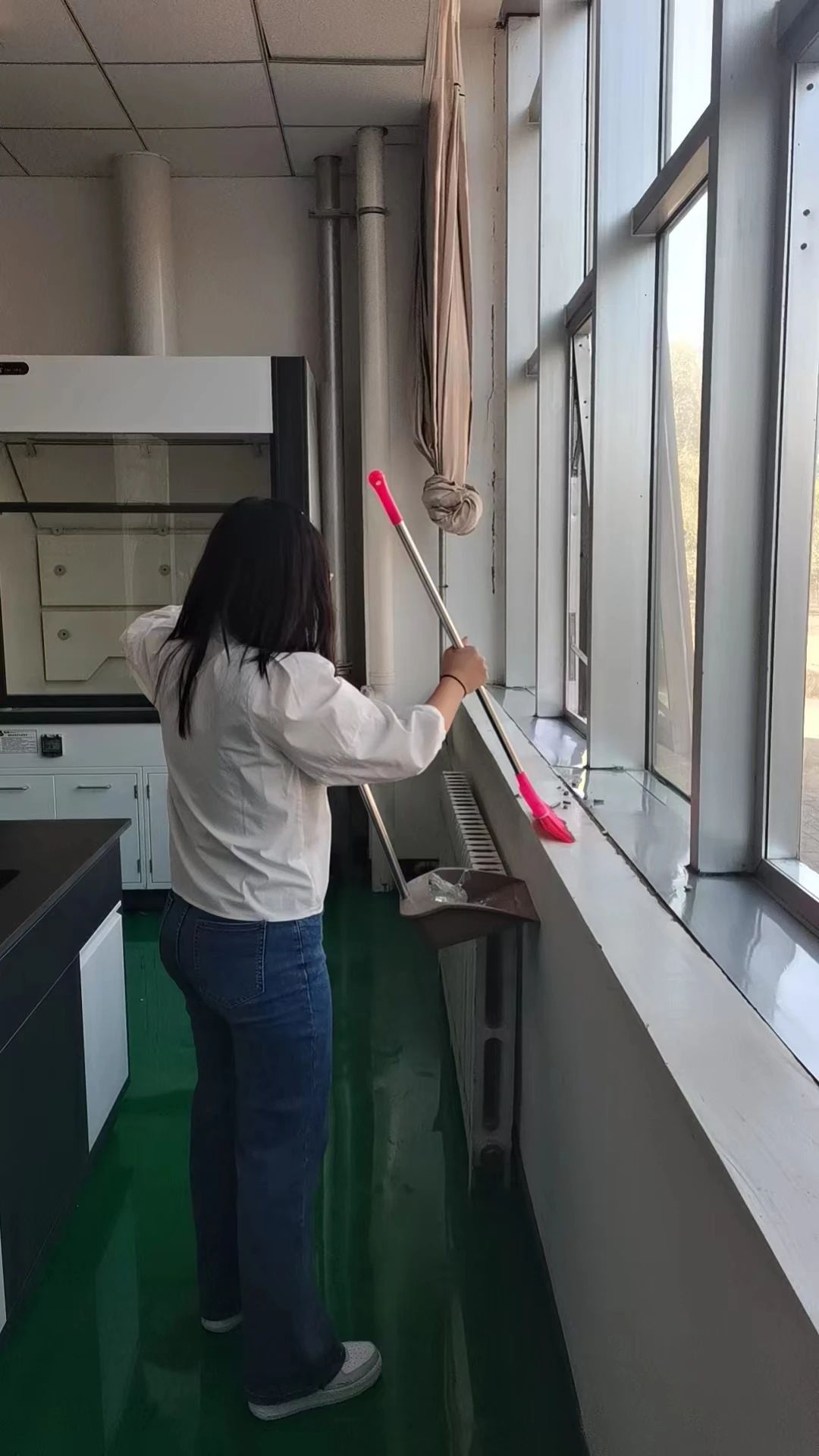 党员们以饱满的热情和务实的态度投入到本次活动中。任务分配完毕后,大家各自去到自己的任务岗位,擦桌子、擦椅子、擦抽屉等、扫地、拖地,擦仪器、擦试剂瓶,每个角落都不放过,大家干劲十足,用实际行动诠释和践行了党员的先锋模范精神,为同学们营造了清洁、美好、舒适的实验教学环境。