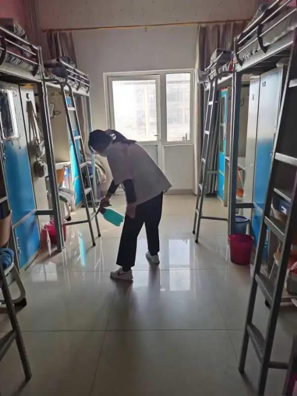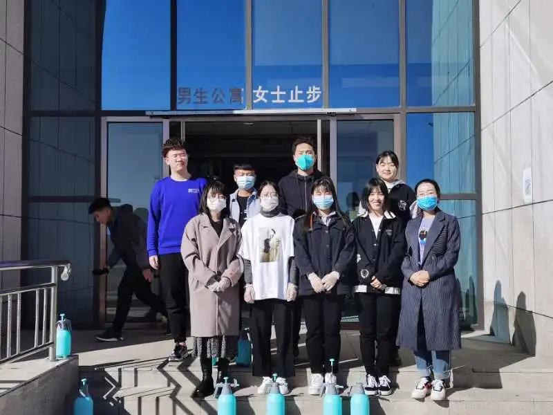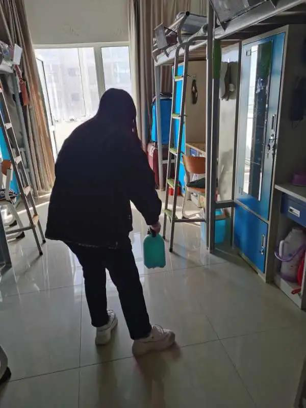 发展对象们按照计划在7号楼公寓下集合,领取喷壶,到指定的宿舍进行消毒。