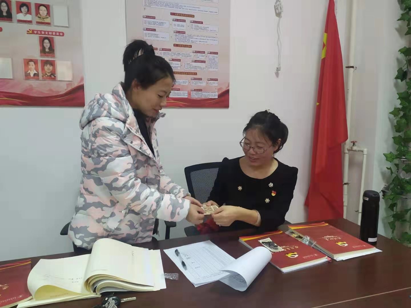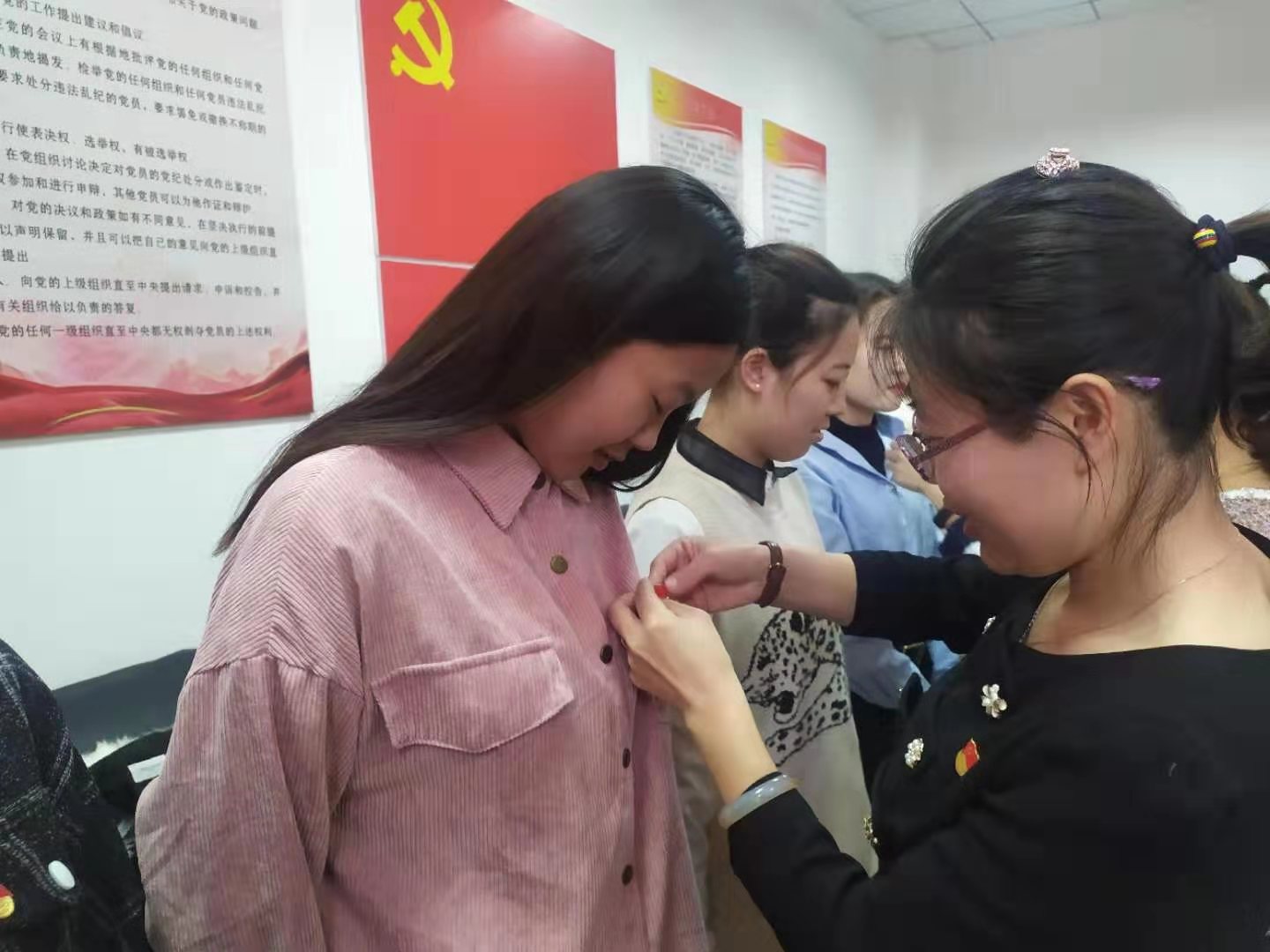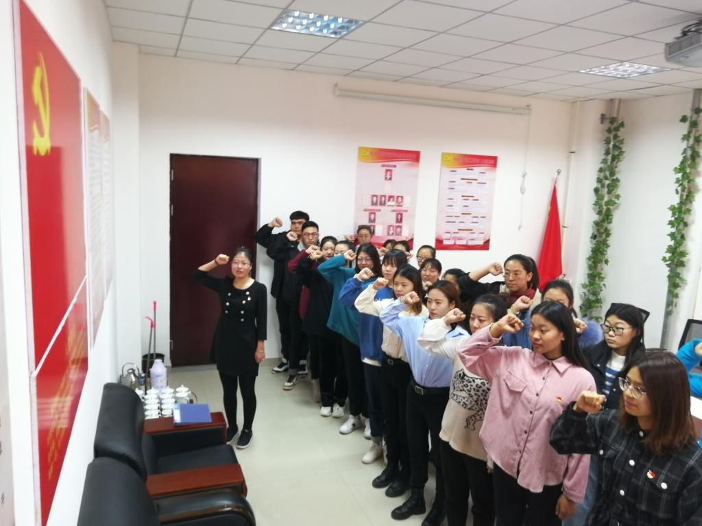 活动中,员工支部正式党员为新接收的预备党员佩戴党徽,全体党员在支部书记岳晓燕的带领下,面向党旗进行入党宣誓。宣誓结束后,党员同志们以现金交纳的方式,主动足额交纳了月度党费。随后,党员同志们一起观看了《我们为了信仰而来》阳早寒春三边牧场陈列馆红色教育实录。