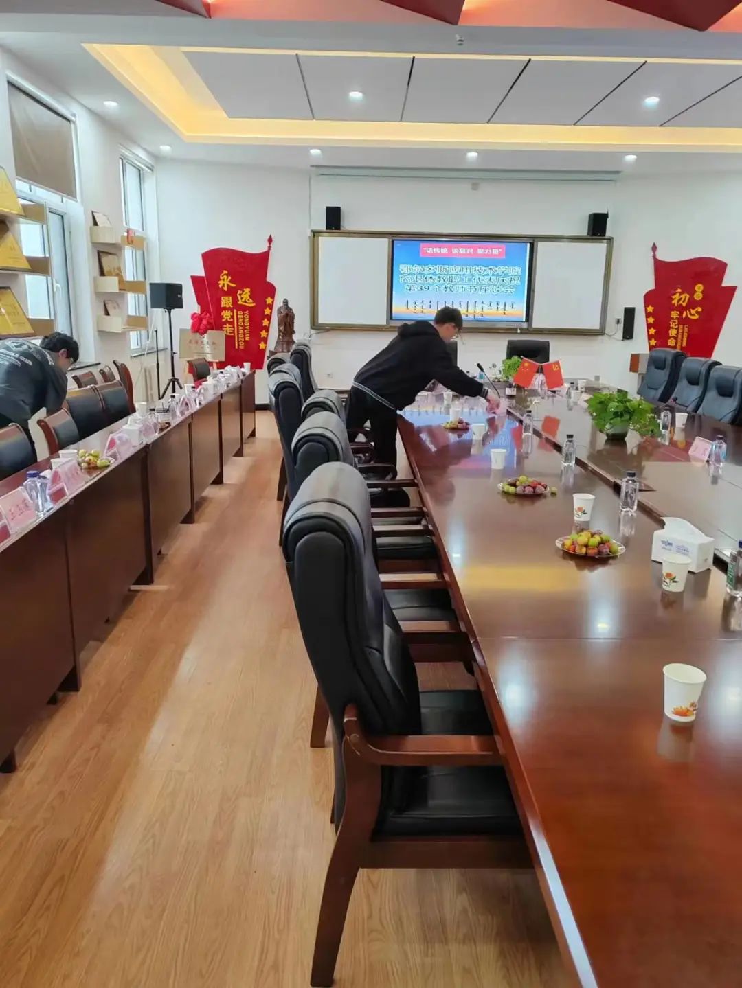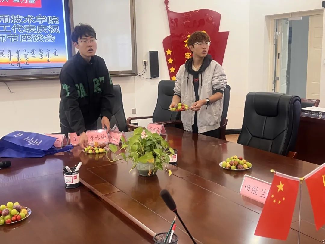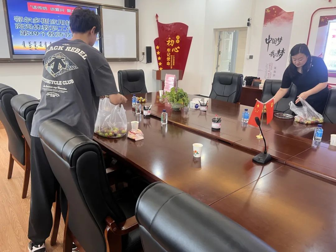 早晨化学工程系第一期青马班学员志愿者来到公司门在工会额尔定达来副主席的带领下迎接28名离退休代表的到来。随后志愿者去了笃学楼201会议室为接下来的座谈会作准备工作。洗水果、摆桌椅、放台签、倒热水、送话筒......志愿者们有条不紊的完成每一项工作任务。座谈会结束后志愿者欢送老师离场后,清理了现场并按照要求整理了剩余的物品。