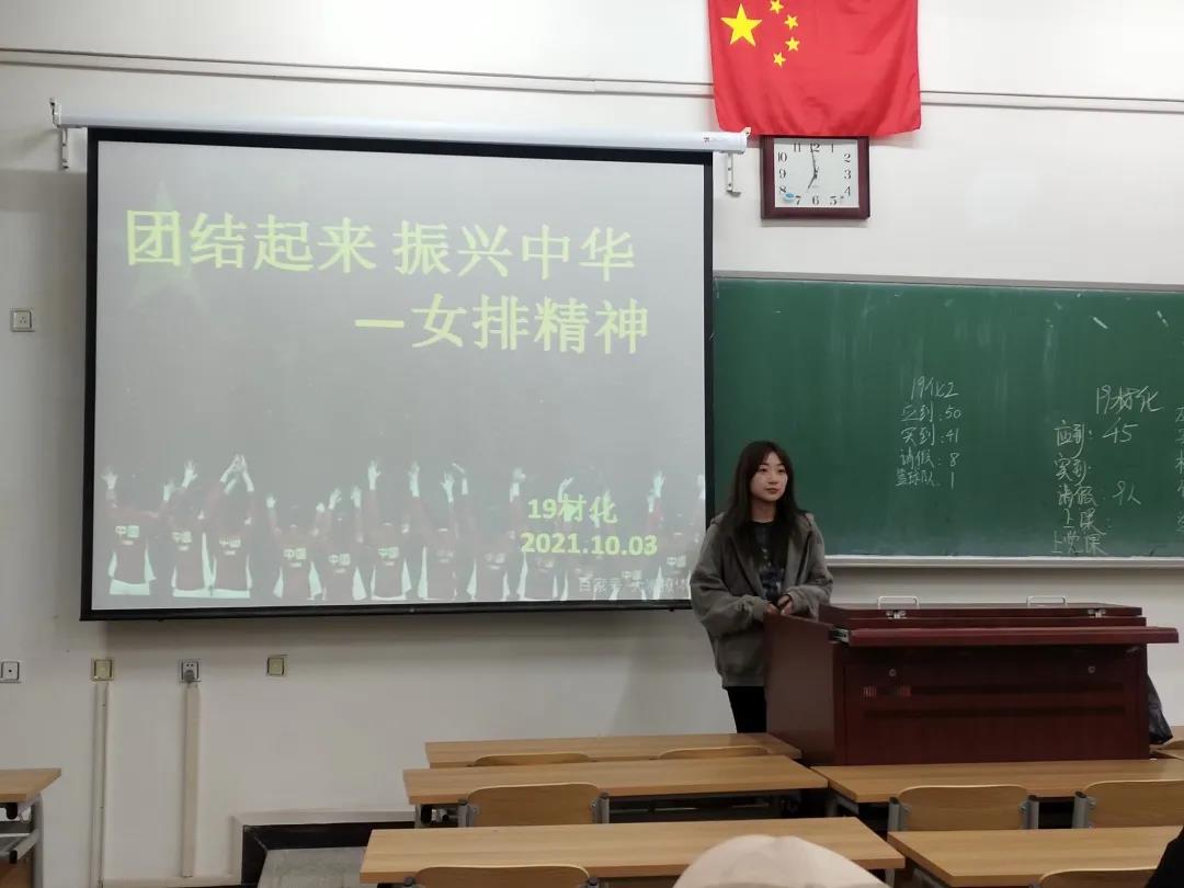 为弘扬团队协作、奋斗拼搏精神,加强爱国主义教育,学习女排精神,2021年10月3日19:00,化学工程系各班举办“请党放心,强国有我”女排精神激励我主题团日活动。