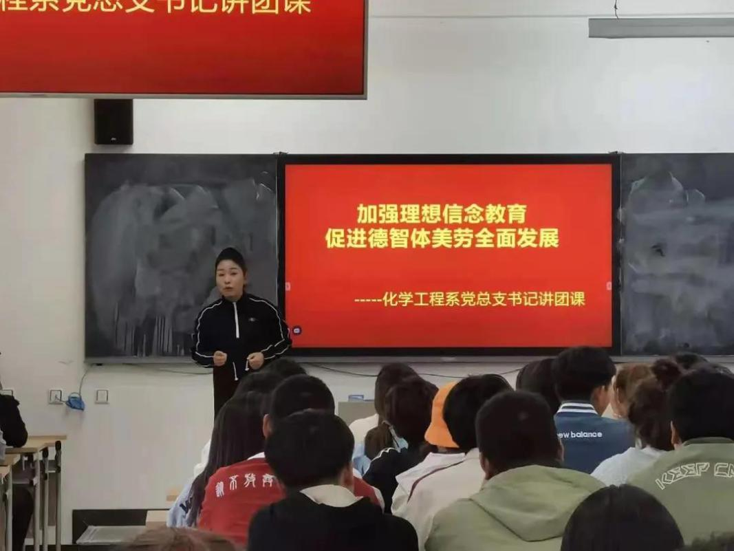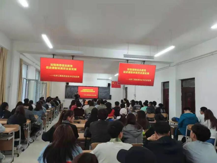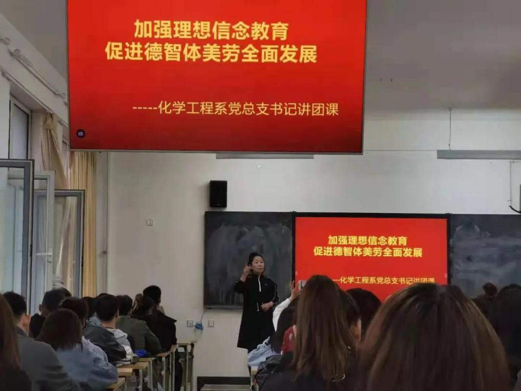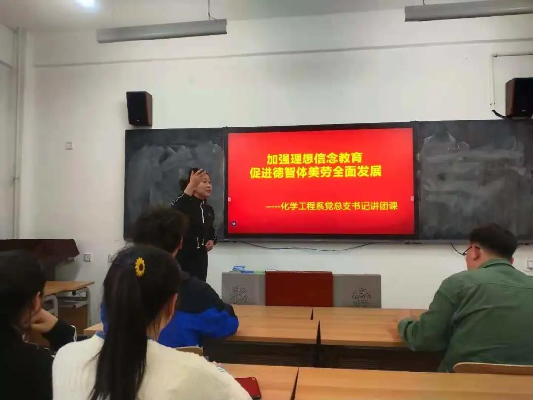 为教育引导共青团员坚定共产主义远大理想和中国特色社会主义共同理想,争做德智体美劳全面发展的时代新人,化学工程系于2021年4月20日晚,在主教406教室组织开展主题为“加强理想信念教育,促进德智体美劳全面发展”的团课活动。此次团课由化学工程系党总支部书记梁建华老师主讲。团总支书记岳晓燕老师、辅导员张名老师以及各班班委、积极分子、发展对象、预备党员、党员以及员工会全体成员150余人参加。
