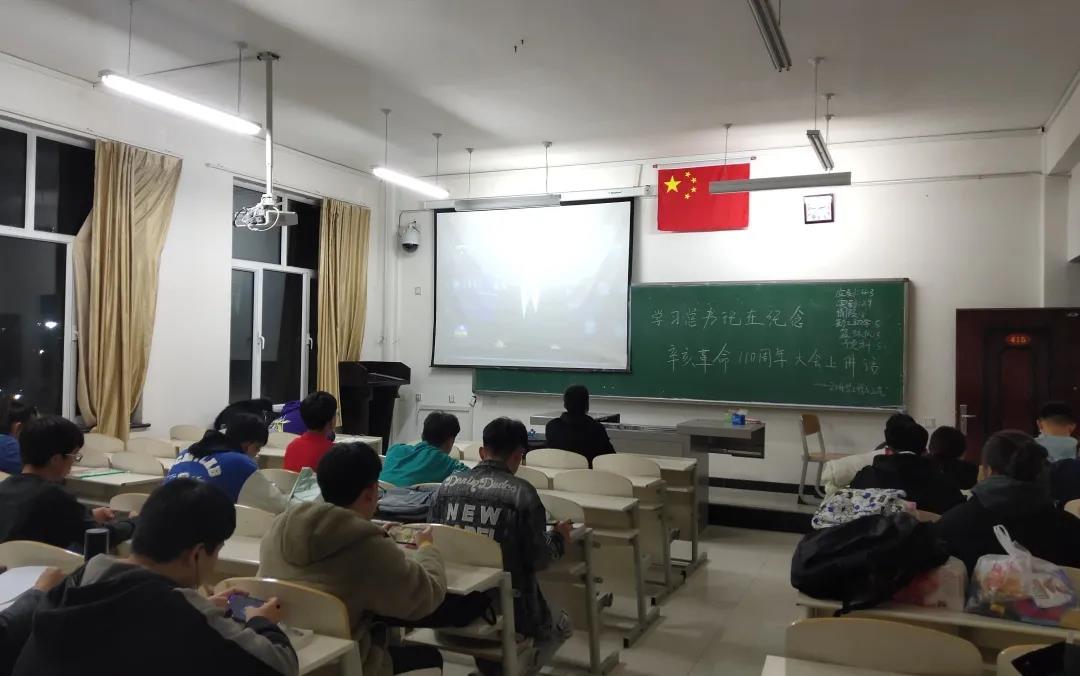 各团支部在团支部书记和团支部副书记的安排下,观看了纪念辛亥革命110周年大会的相关视频,认真聆听了习近平总书记在纪念辛亥革命110周年大会上的重要讲话。总书记的重要讲话立意高远、思想深邃,鼓舞人心、催人奋进,激励海内外全体中华儿女更加紧密地团结起来,携手向着中华民族伟大复兴的目标继续奋勇前进。