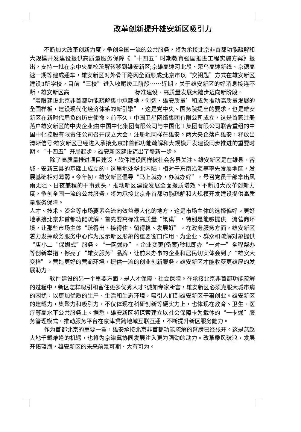 雄安“新”变主要讲述了雄安新区的设计,规划,以及协调,绿色,共享的发展理念,雄安新区将是我们留给子孙后代的历史遗产,必须坚持“世界眼光、国际标准、中国特色、高点定位”理念,努力打造贯彻新发展理念的创新发展示范区。