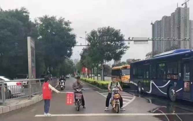 志愿期间,他俩执勤的路口路况极为复杂,高峰时的人流量高。一次红灯,自行车道就能积压几十人。时间对这些出行者来说很宝贵,因此有序疏通交通就成了本次志愿服务的重点。红灯亮时他俩举起小红旗,引导行人停下,耐心地等待绿灯。除此之外,为了大家的安全,他俩还会提示骑行电动车的人们佩戴头盔。