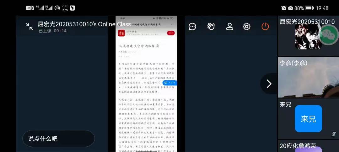 此次班会,以作风、学风和诚信的关系和以诚信建设守护网络家园为主要学习内容,倡议同学们勤学上进,坚持良好的学风和工作作风,在日常生活和工作中自觉践行诚信的美德,共同守护网络空间的天朗气清、生态良好。