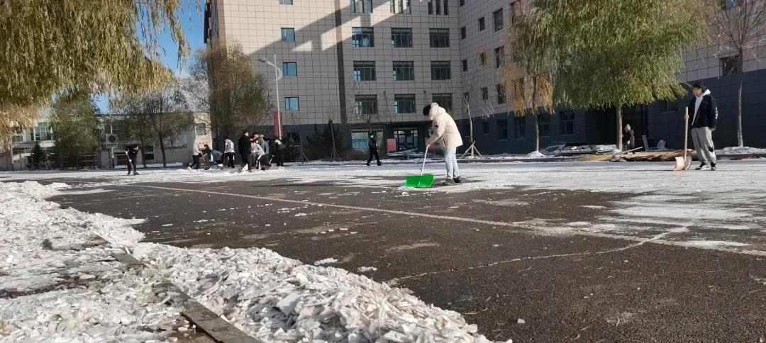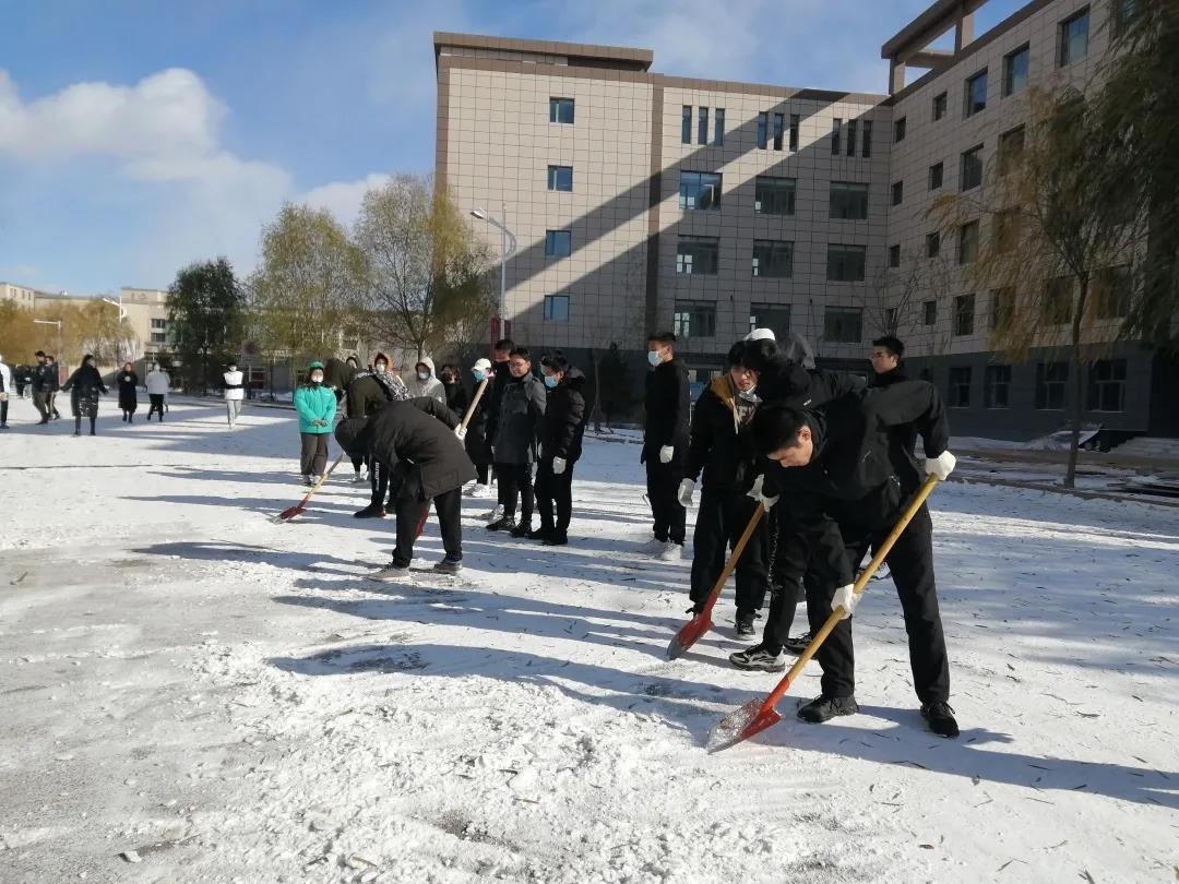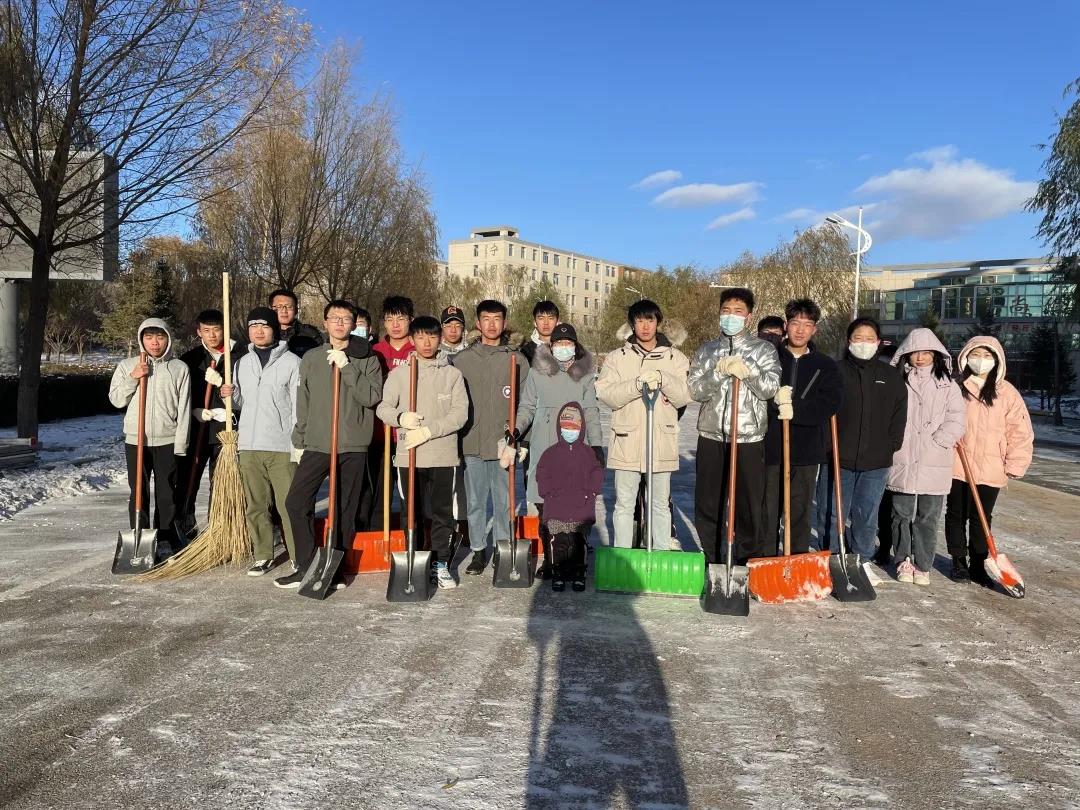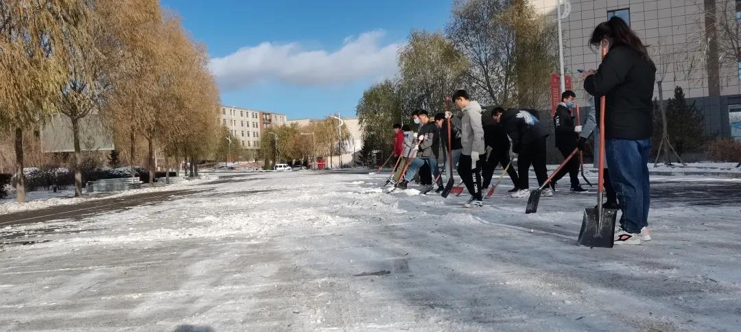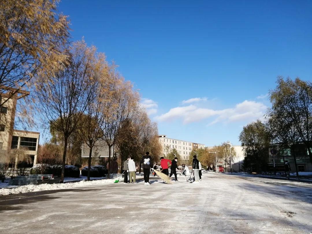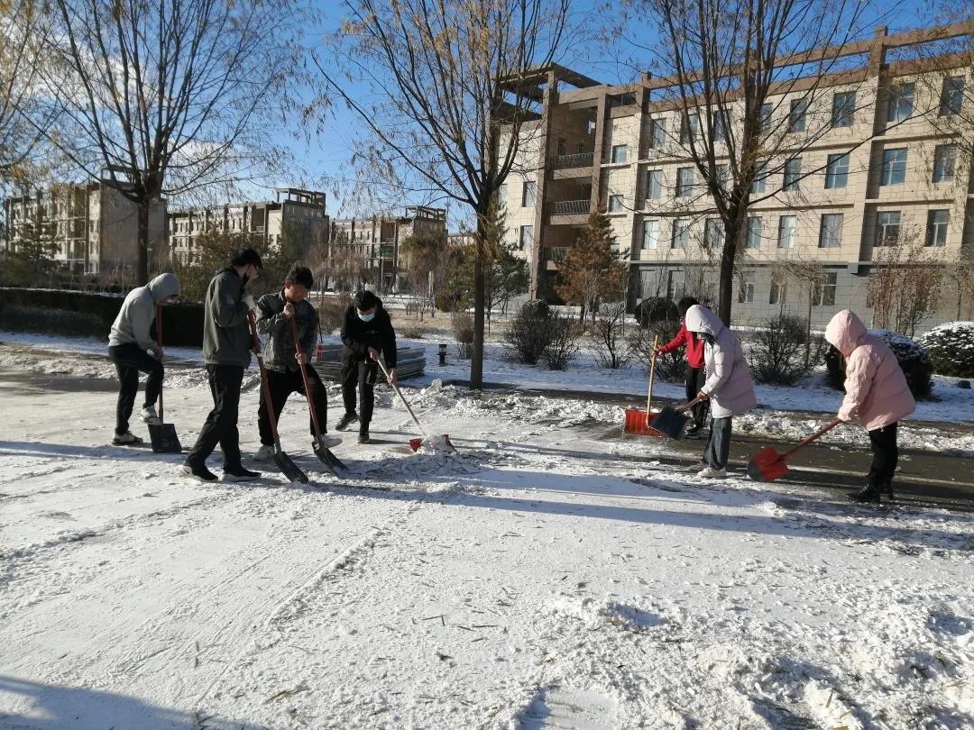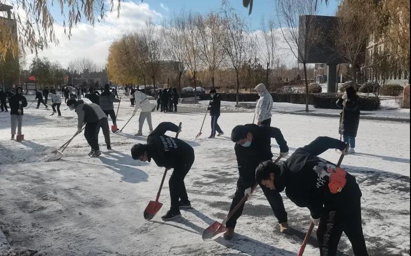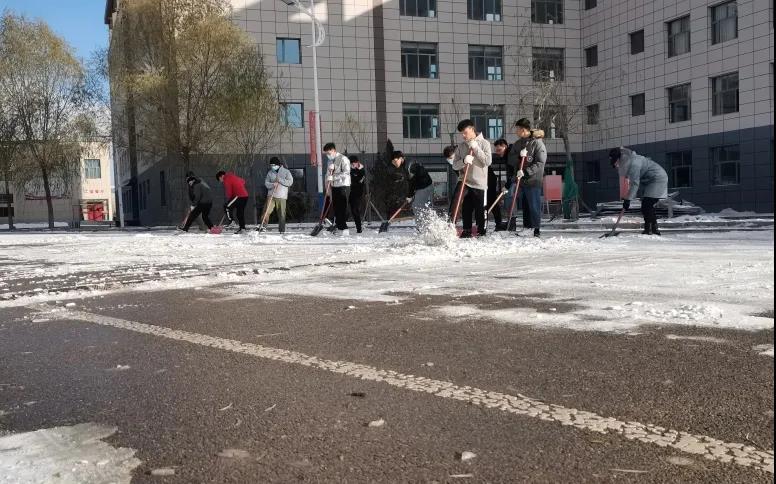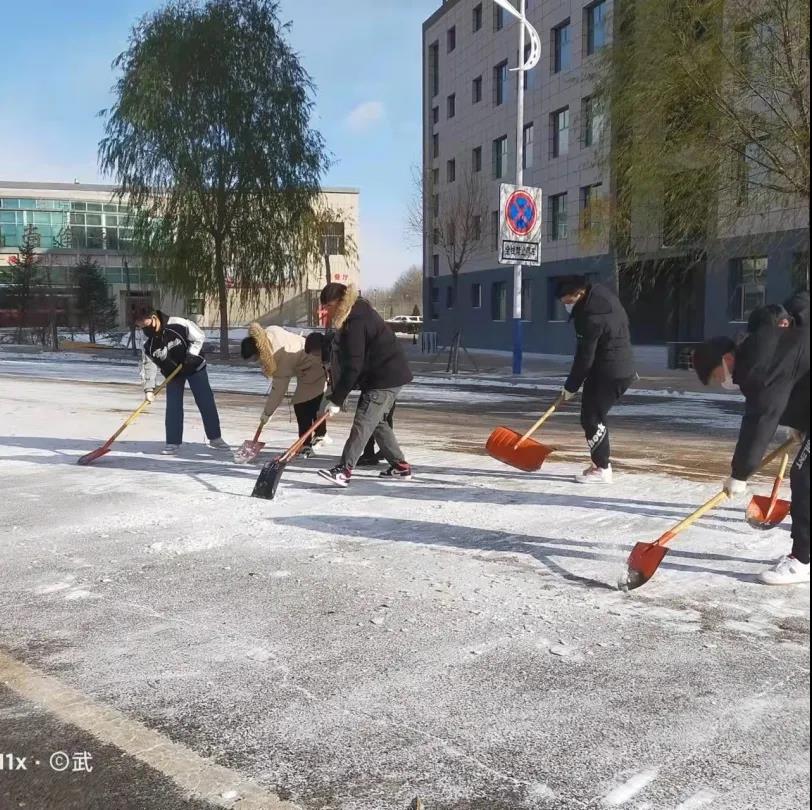冬日的第一场大雪翩然而至,清晨的校园在白雪的覆盖下,俏丽多姿,纯净清雅。银装素裹的美景让人赏心悦目的同时,也给校园安全出行带来隐患。为保障师生出入安全和道路畅通,2021年11月7日,化学工程系学工办主任岳晓燕老师带领同学们开展“勤为径劳作舟,绽放青春芳华”新时代劳动教育校内实践活动——校园环境治理扫雪活动。