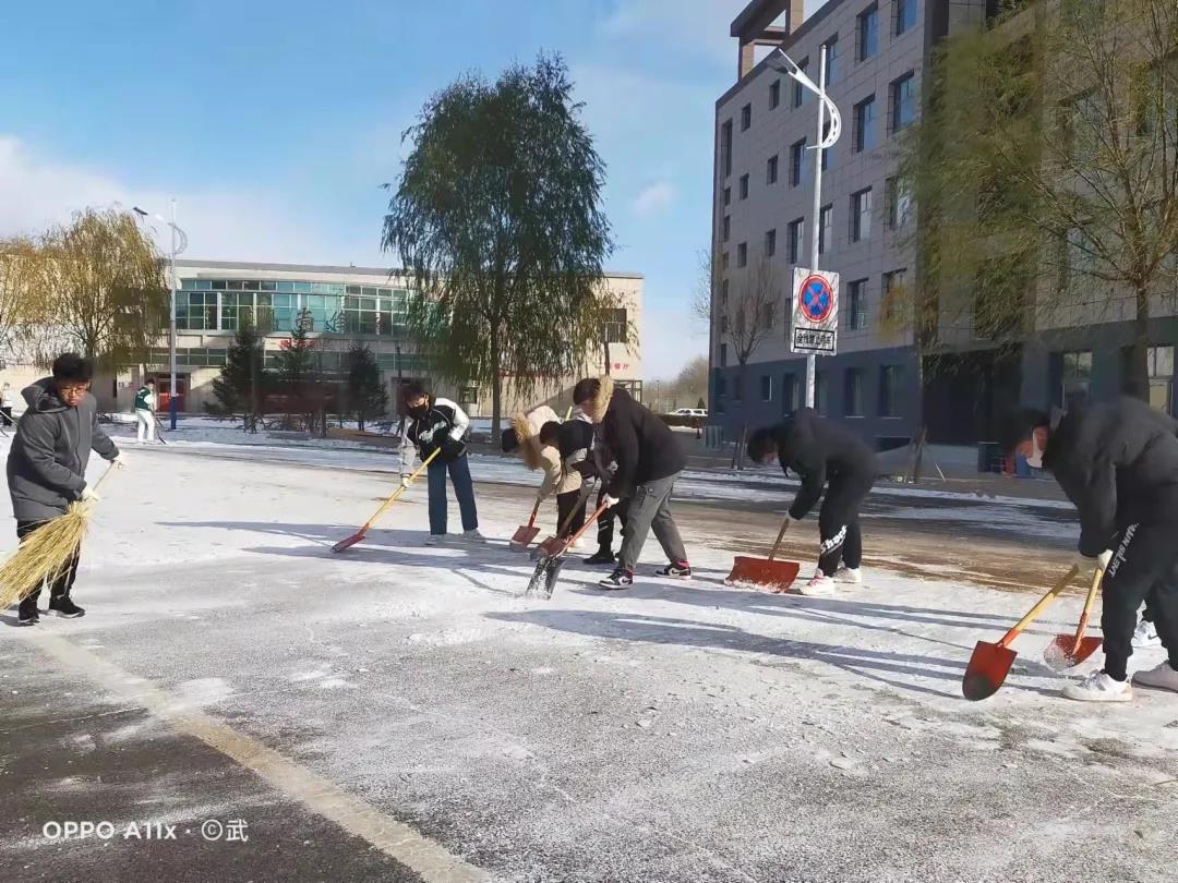 在岳老师的带领下同学们认认真真的一铁锨一铁锨地铲着雪,顾不上那被冻的通红的双手,也忘记了身体的疲惫。经过两个多小时的集体劳作,路面的积雪被清扫的干干净净,确保了师生出行安全。