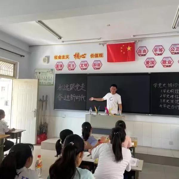 作为志愿义教老师,每天为孩子们讲解书本知识,进行课后练习,完成暑期作业并开展课下体育活动课程。除此之外,还进行一天一次的党史课程的学习。