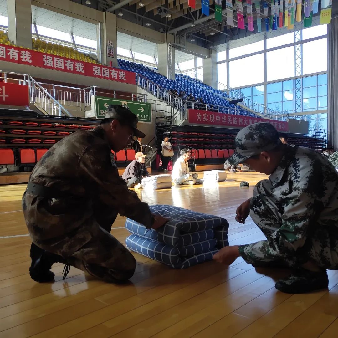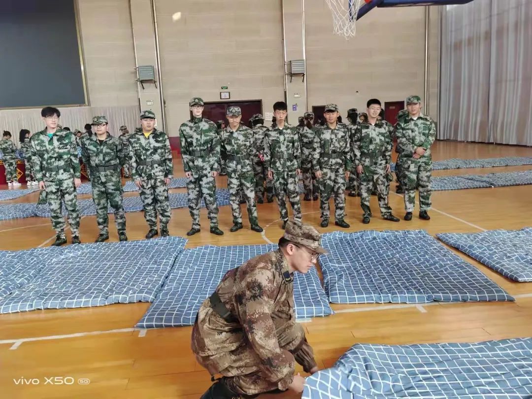 8:00—10:00,内务整理。公司的国旗护卫队队员以及退伍军人在体育馆指导新生如何将被子叠成“豆腐块”。他们从被子的对折尺寸、折叠手法、压实被子等方面做出了详细的讲解并进行示范。之后,新生拿着自己的被子开始实地操作。大家认认真真,一丝不苟,势必要叠出“豆腐块”。