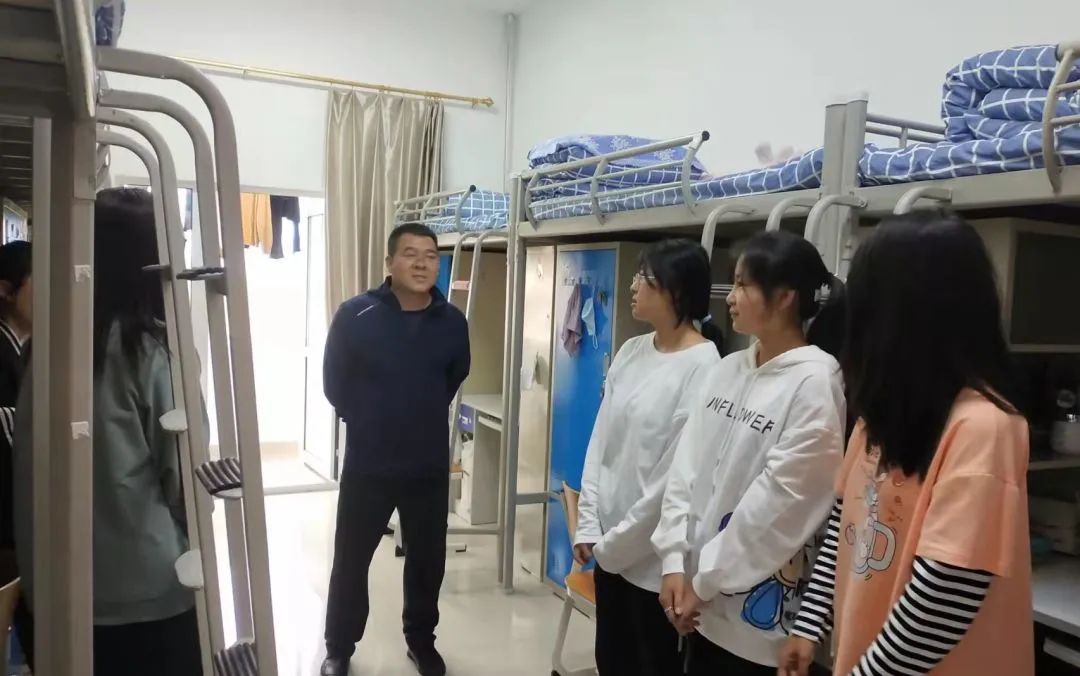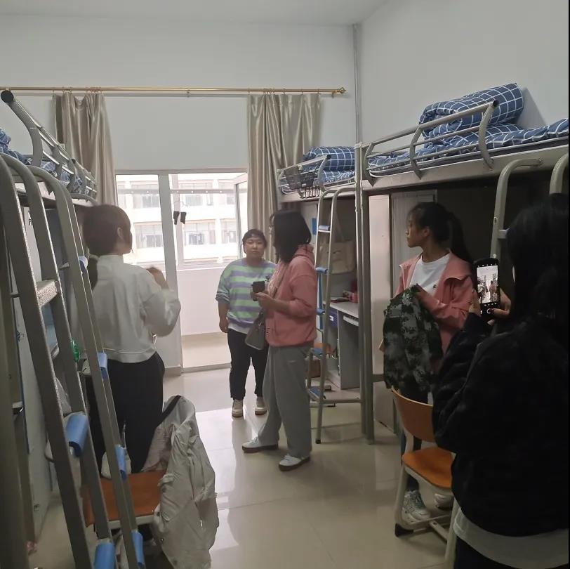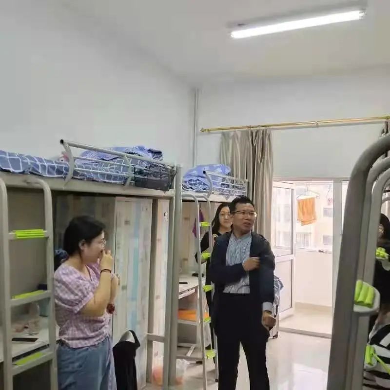 走访过程中,各位老师以及班导了解了新生们的饮食和住宿情况,查看了宿舍卫生以及内务的整理情况,与新生一同检查了宿舍内各种设施和设备,细心叮嘱了宿舍用电安全、外出交通安全、人身财产安全等问题,提醒新生们做好疫情期间的自我防护工作。