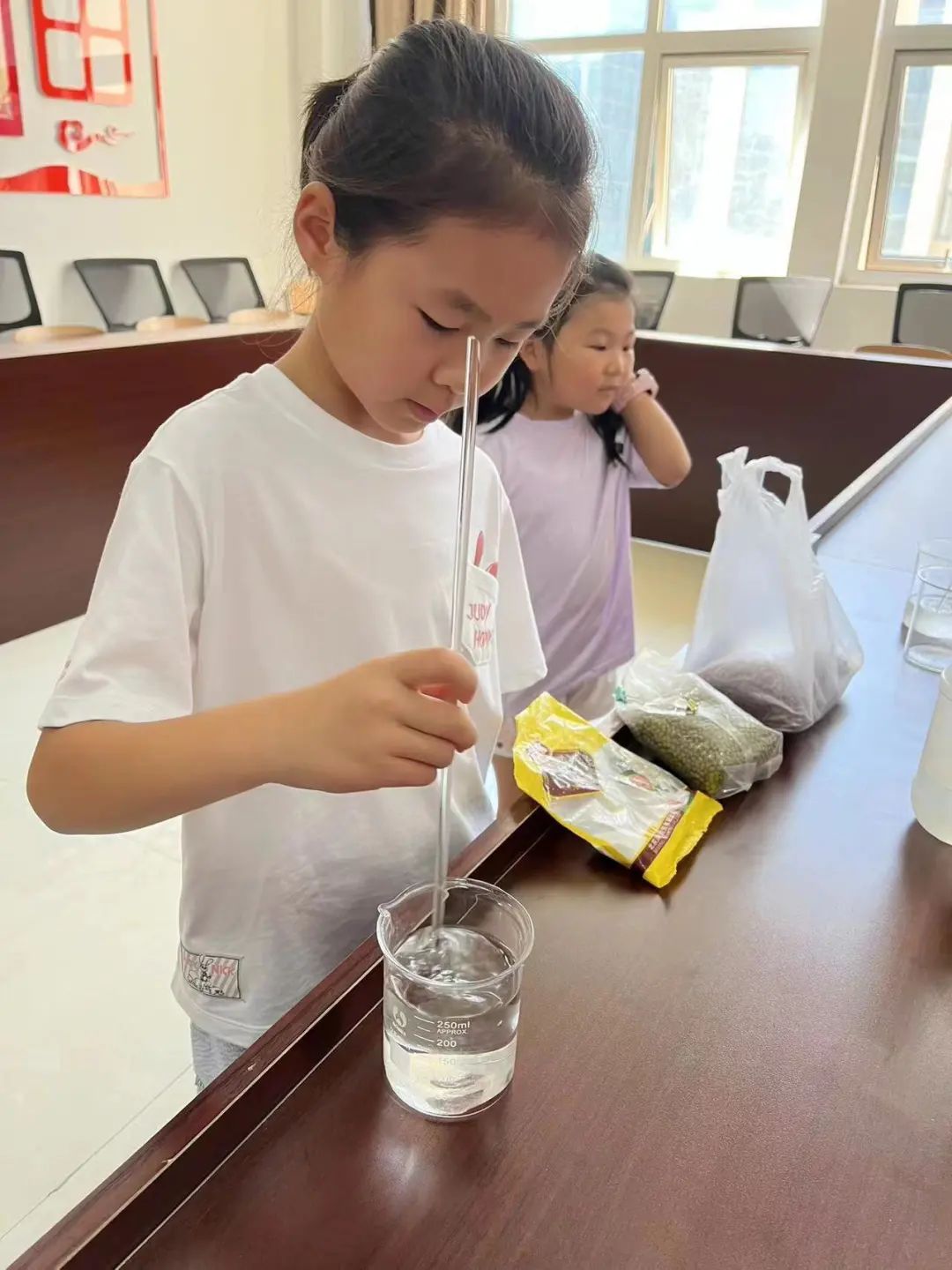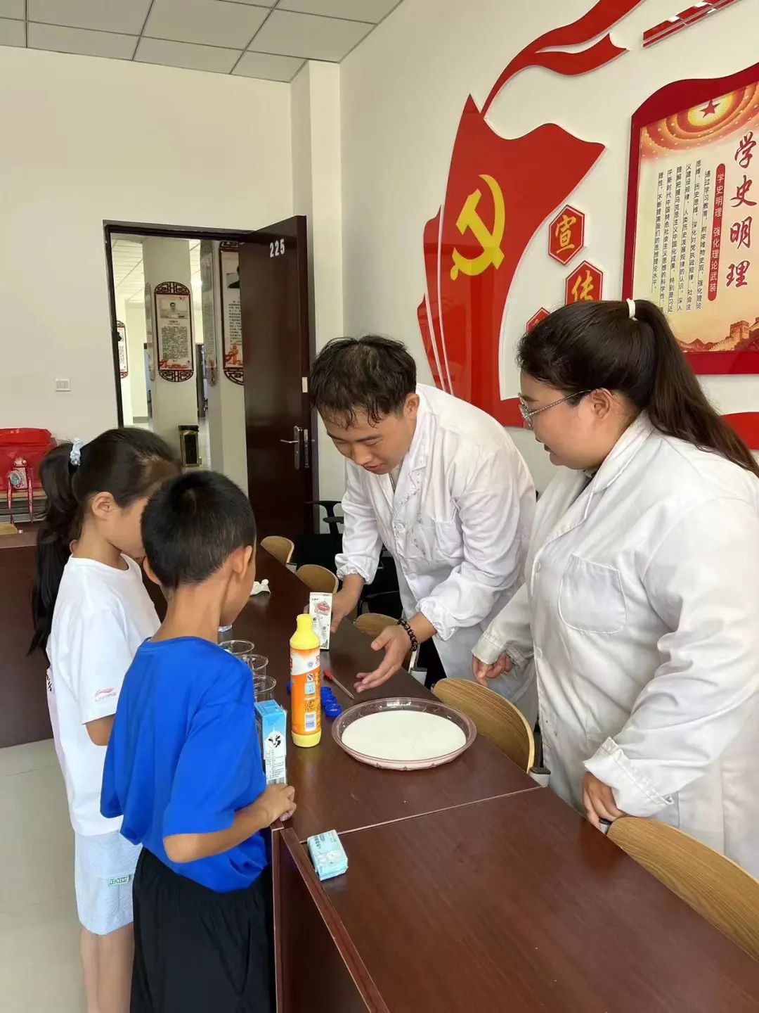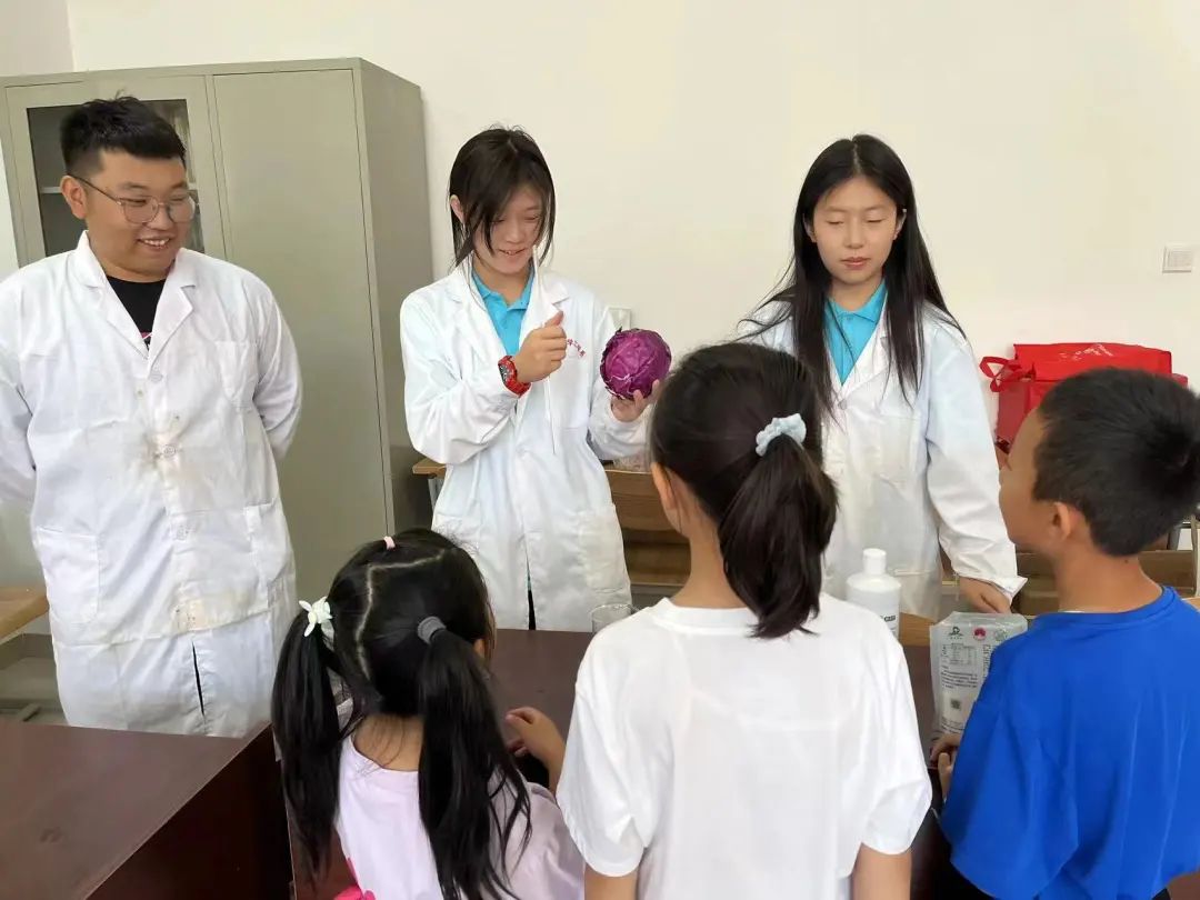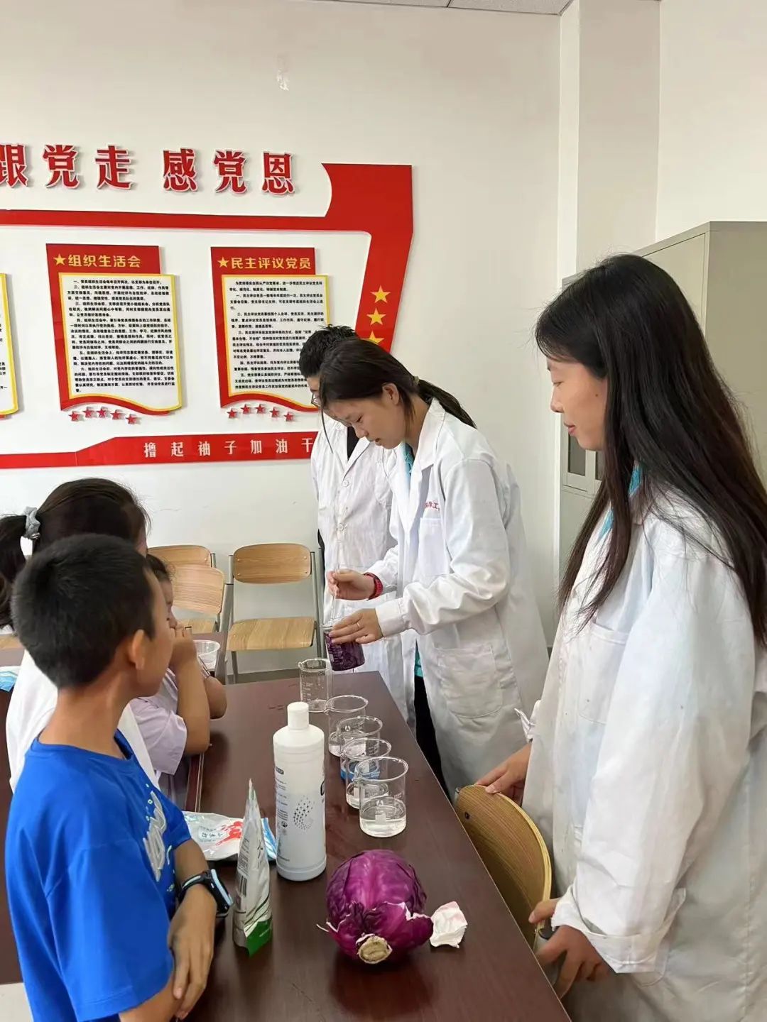 活动中,成员为小朋友们讲解实验所需的器材和药品,演示实验流程,耐心指导每个步骤中所需要注意的方法和技巧。会游泳的神奇豆豆实验中只需往杯中加入白醋、苏打、豆豆即可制作游泳的豆豆!魔法变色水实验则是利用酸红碱蓝的原理,用紫甘蓝制作完成。沸腾的彩虹牛奶依靠牛奶、色素、洗洁精来实现,利用色素密度小于牛奶,洗洁精破坏牛奶表面张力的原理,得到沸腾的彩虹牛奶。