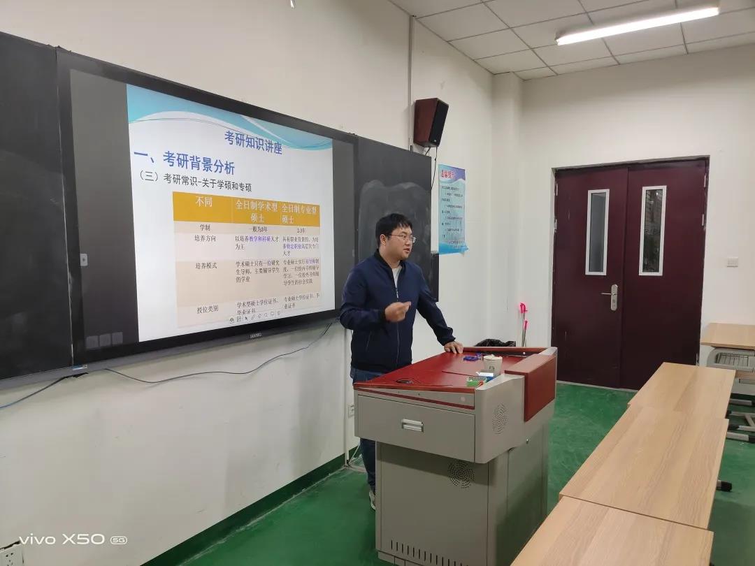讲座上,李老师首先从考研背景分析、考研基本流程、考研专业选择和考研复习准备四个方面给大家进行了详细的讲解,接着结合自己的考研经验,就如何备考、如何安排自己的复习时间、如何查找资料、如何准备笔试和面试做了详细的介绍,提出了很多实用的意见和建议。本次考研讲座持续了一个多小时,李老师的指导,例举丰富,贴近现实,在场的同学们受益匪浅。最后李老师强调,一定要养成良好的学习习惯,形成自己的学习规律,“宝剑锋从磨砺出,梅花香自苦寒来”,用自己的实际行动实现考研的既定目标!